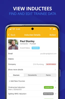 S ovom aplikacijom, upravljanje vašim timom nikada nije bilo jednostavnije. Bilo da koristite Rapid Induct za obuku ili Rapid Incident Reporting za izvještavanje, pristup informacijama o polaznicima postaje agilan. Brzo pretražujte podatke o zaposlenicima, pregledavajte detalje o završenim tečajevima i dokumentima poput certifikata ili licenci, pa čak i dodjeljujte lozinke za pristup online tečajevima. Provjera usklađenosti vaših radnika postaje trenutačna – jednostavno skenirajte QR kod s Rapid Induct ID kartice ili unesite ime i prezime za uvid u status, idealno za provjere na licu mjesta.