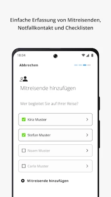 Kako biste otključali puni potencijal "Travel Admin" aplikacije, jednostavno registrirajte svoje putovanje, navedite suputnike i unesite svoje kontakte za hitne slučajeve. Kroz aplikaciju, jednostavno bilježite detalje o planiranom odredištu, a tijekom samog putovanja, samo jednim dodirom zaslona možete podijeliti te podatke sa svojim odabranim kontaktima. Mogućnost brzog ažuriranja vaše lokacije osigurava da vas EDA može promptno informirati o trenutnoj sigurnosnoj situaciji i, u kriznim scenarijima, o mogućnostima povratka. Pored toga, iskoristite praktične kontrolne liste ili ih prilagodite svojim individualnim zahtjevima za savršeno organizirano putovanje.